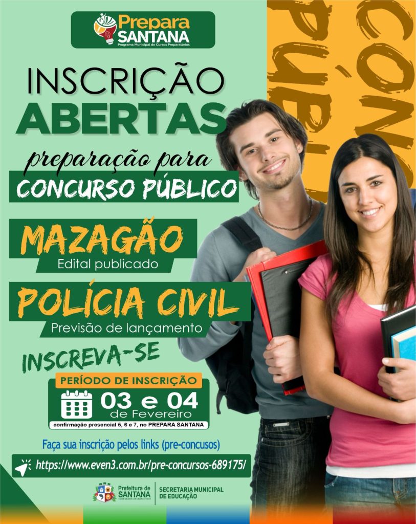 O Programa Municipal de Cursos Preparatórios – Prepara Santana abre inscrições para uma nova turma direcionada à preparação para concursos públicos, com um núcleo básico de estudos voltado tanto ao concurso do Mazagão, que já possui edital publicado, quanto ao concurso da Polícia Civil, com previsão de lançamento.